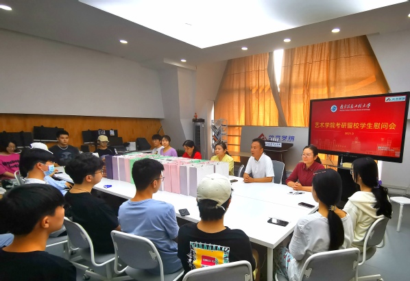 为激考研留校学子的学习热情,表达中秋佳节的问候,9月18日上午10点艺术学院党委在逸夫楼S527举行考研留校学子慰问会。艺术学院党委书记许建康、副书记詹筱茹、学办主任关颖婧、毕业班辅导员鹿丰玲、俞世兰、茆彭和留校的近40位考研学子参加了慰问会。