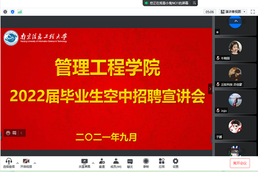 3位就业导师、4家优质企业、23个就业岗位、近百名本硕博毕业生相聚“云”端,共同探讨学院毕业生高质量就业工作,这就是9月15日管理工程学院2022届毕业生秋季线上招聘宣讲会的现场实况。