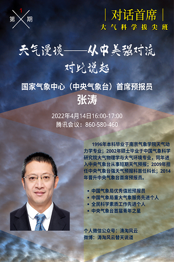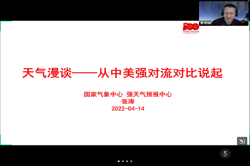 4月14日,大气院在线上组织开展第一期大气科学拔尖班“对话首席”活动,邀请国家气象中心首席预报员、我校1996届本科毕业生张涛首席以“天气漫谈——从中美强对流对比说起”为主题进行交流对话。2020级、2021级大学科学专业拔尖班全体同学参加此次活动。