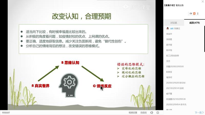 为帮助同学们调节疫情封校环境下出现的负面情绪,培养大学生阳光、健康的心理素质,4月23日上午,计算机学院特邀我校心理中心专职教师陈真征在腾讯课堂开展主题为“守护心灵的‘绿码’”线上心理健康讲座,学院辅导员及在校学生聆听了此次讲座。