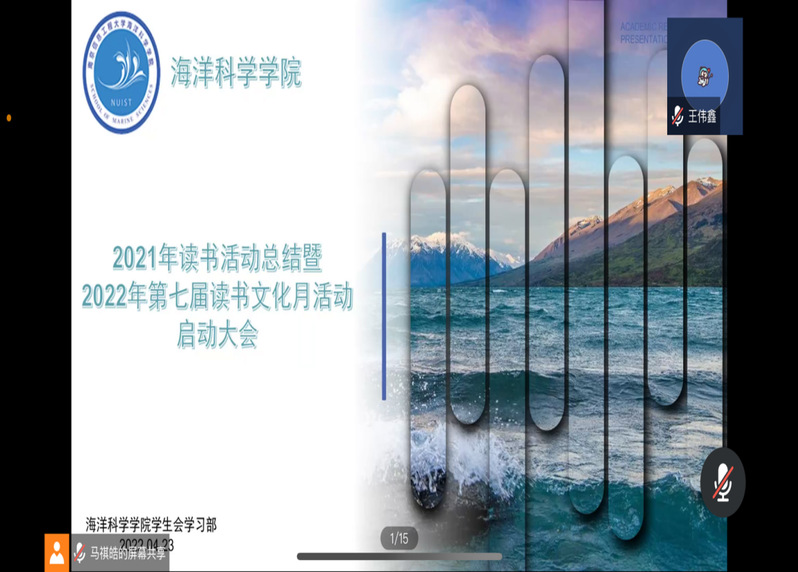 为扎实推进海科院读书文化建设,营造浓厚的读书氛围,增强同学们的文化底蕴,4月23日上午,海洋科学学院召开线上“2022年第七届读书文化月活动启动大会”。海洋科学学院学办主任张彦辉与学院低年级全体同学参加,院学习部部长马祺皓同学主持。