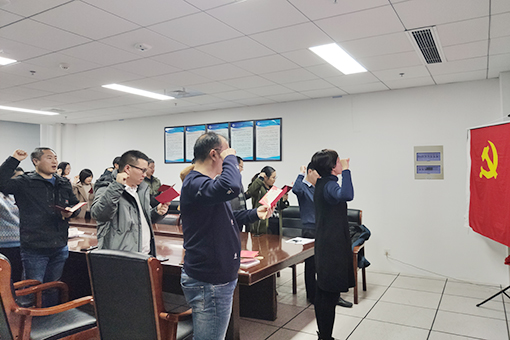 最后,每位教工党员依次上台,准确报出自己入党时间的同时接过学院党委专门准备的政治生日贺卡,并在鲜红的党旗前合影留念。最后,全体起立,右手握拳,在贾冰书记的带领下,庄严宣誓,重温誓词。