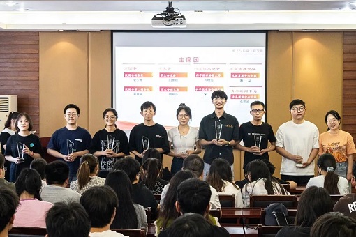 本次活动分为以下四项议程:共唱团歌、聘书授予仪式、金红老师致辞以及合影留念。第一项议程,全体起立,共唱团歌。嘹亮坚定的歌声与同学们青春朝气的面庞展现着学院团学干部的风采与优良风貌。聘书授予仪式中,老师们依次为团学组织干部颁发奖杯、聘书并合影留念。简简单单的证书,不仅是对他们一年来点滴付出的记录,更是对全体同学无私奉献的肯定与感谢。在过去的一年里,正是有了学生干部的发光发热,让微弱的萤火汇聚在一起,才有了电信院的闪耀。第三项议程,由金红老师为大家致辞。金老师见证了大家一年当中的成长,对团学组织学生干部的工作态度和工作能力予以肯定和赞赏。致辞中,金老师还表达了对大家的不舍,祝愿全体同学在今后的考研和工作当中取得辉煌战果。最后,金老师也对新一届团学组织提出了期待与展望,希望在未来的一年中,新一届团学组织能够继承学长学姐们的拼搏精神,团结协作,共创电信院更加美好的未来!