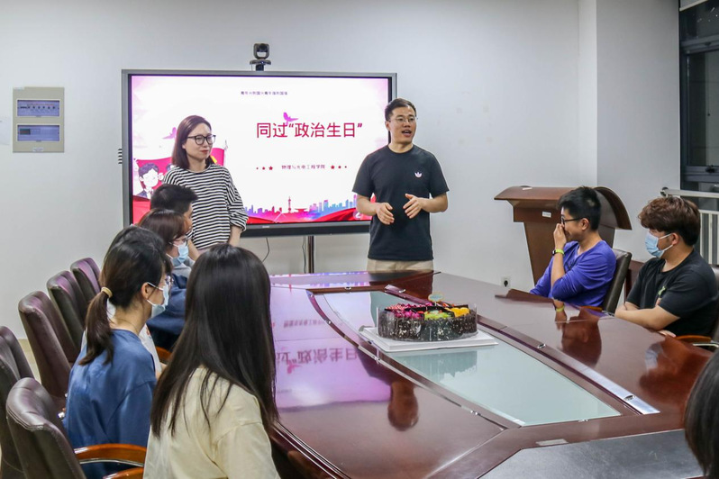 在藕舫楼330会议室,学生党支部书记张龙华、组织委员孙英男和近20名学生党员及团员代表欢聚一堂。一起许下政治生日愿望、分享政治生日蛋糕、重问入团入党初心、重忆入团入党经历、重听一次团课党课……内容充实、形式新颖的“政治生日”套餐,使学生党员及团员代表切实感受到组织的温暖,增强了他们的政治荣誉归属感和责任感。