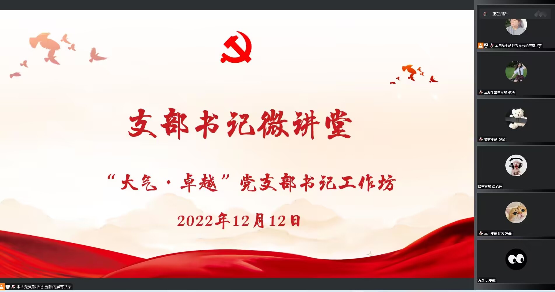 为进一步推动学院学生党建工作发展,创新学生党建工作方法途径,提升学生党支部书记的业务能力和工作水平,12月12日晚,大气科学学院开展“大气·卓越”党支部书记工作坊之支部书记微讲堂活动。硕士研究生第四党支部书记李万玲和本科生第四党支部书记刘伟两位同志,线上分享党支部书记工作经验,全体学生党支部书记参会。
