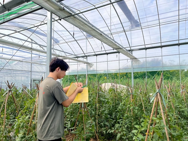 随后,同学们在胡先生的指导下,给果树张贴诱虫板。看似轻松简单的工作,操作起来实际需要十足的耐心和细心。不一会儿,同学们就已经汗流满面,鞋子沾满泥土,衣服和裤子也沾染上了洗不掉的果渍。但大家仍然在兴高采烈忙个不停,22级水资源专业的朱小雨同学感言,“原来劳动的果实才是真的透心甜”。在整个实践过程中,胡先生没有提过自己曾经获得过诸多荣誉,谈及对新时代有什么展望时,胡先生只是微笑坦言:“做好当下的本职工作,把地种好,把该做的做好也是对国家做贡献。”他这样谦虚、低调、重实干的品质让同学们零距离感受了劳模的风采和魅力,也让同学们体会到了不同领域、不同行业的工匠精神、创新精神,并将劳模精神、劳动精神深深植入心中,争做崇尚劳动、热爱劳动、辛勤劳动、诚实劳动的优秀新青年。