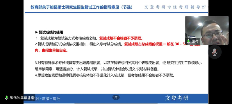 1月6日晚,文学院举办2023届考研复试调剂线上指导讲座,学院今年刚结束考研初试的全体同学在线参加。此次讲座由文登考研张伟老师主讲,辅导员李渊主持,文学院党委副书记、副院长吴鹏飞出席讲座。