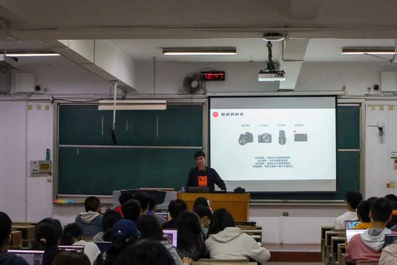 首先,摄影部的负责人袁承煜向同学们介绍了一些摄影原件知识,涵盖相机的种类、镜头的种类、滤光镜等方面,让同学们进一步了解了摄影。紧接着,他向同学们讲解摄影的方法,例如照片的亮度是一个重要的属性,曝光就是调控光线的方法等。除了理论讲解,他还结合实例进行介绍,让同学们对摄影方法理解得更加清晰透彻。优秀的拍摄能力,同时也需要完美的后期处理辅助。为此,袁承煜通过三张照片向同学们详细讲述了软件的基本使用方法,并鼓励同学们积极尝试后期处理,极大地激发了同学们的学习热情。