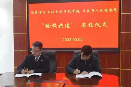 为认真贯彻落实中共中央办公厅、国务院办公厅《关于加强新时代法学教育和法学理论研究的意见》精神,创新法学人才教育与培养模式,推动法学理论与检察实务相融合,3月2日,法政学院与天长市检察院共同签署共建合作协议,签约仪式在天长市检察院举行。天长市检察院党组书记、检察长王超、副检察长吴梅,南京信息工程大学法政学院院长陈俊、副书记(主持工作)张昳丽、副院长徐骏、法律系教工党支部书记王晓强等人参加。