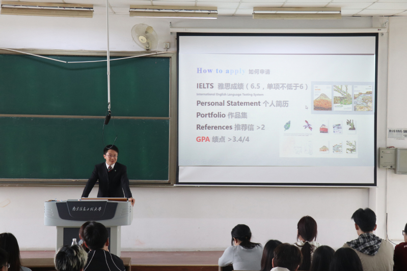 随后,艺术学院数字媒体艺术系讲师,英国利兹大学博士王铮老师给大家做题为“我的英国留学生活”的讲座。他以自身的留学经历,给在座同学介绍了出国深造的目的意义和出国的收获,分享自己的留学申请的经验与方法,同学们认真聆听,受益匪浅。