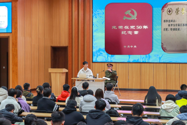 为深入开展理论学习教育,缅怀革命楷模,传承红色基因,领悟二十大精神,3月17日晚,计算机学院、网络空间安全学院特邀九十岁抗美援朝老兵邵泽忠先生在滨江楼二楼报告厅为学院全体党员、入党积极分子和发展对象讲授“忆峥嵘岁月 斫光芒坦途——一位九十岁抗美援朝老兵的故事”主题党课。党课由辅导员刘杰主持。