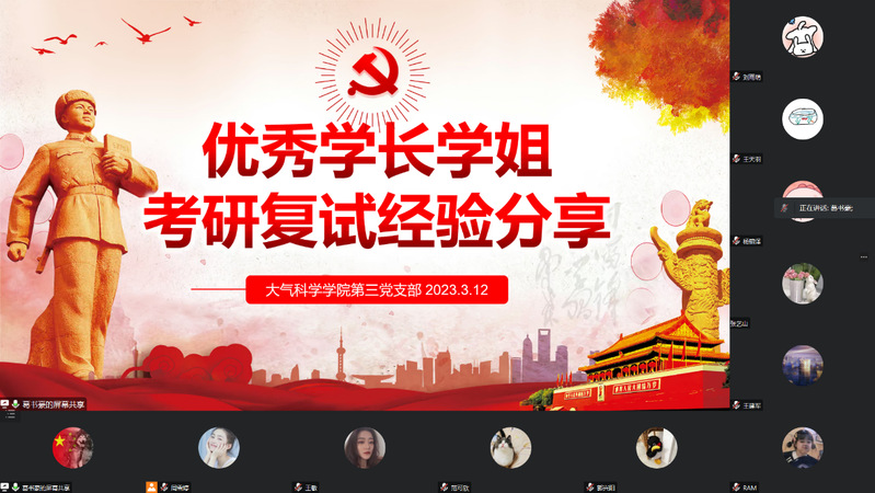 为帮助学院2019级考研同学尽早开展复试规划,了解考研复试的内容和流程,为大家介绍复试及调剂经验,助力同学们在考研复试的过程中明确目标、提高成功率。3月17日,本科生第三党支部在线上组织开展“榜样力量,一路相伴”考研复试经验分享会,邀请八位就读于不同院校的优秀毕业生与大家进行分享,活动由党支部组织委员葛书豪主持。