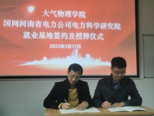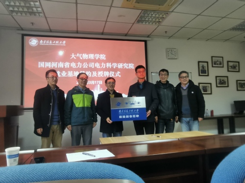 最后,双方代表举行了“南京信息工程大学大气物理学院·国网河南省电力公司电力科学研究院”优质就业基地建设协议签订及授牌仪式,正式达成合作。