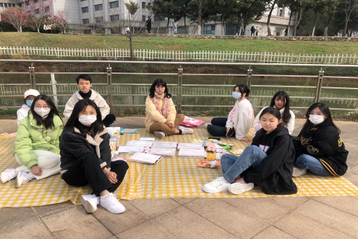 活动伊始,同学们围坐一圈,主持人带领大家一起玩起了“正话反说”的破冰游戏。游戏后,大家分别进行自我介绍,相互熟悉进行交流,一起谈论自己心中春天的样子和感悟。大家相继发言后,主持人为每个人分发了画板,同学们开始在天鹅湖畔通过绘画感受春天。
