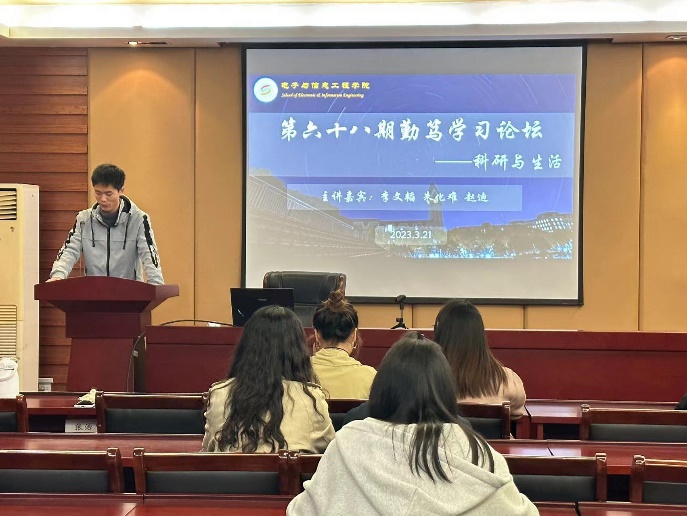 3月21日,电信院第68期研究生“勤笃”学术论坛在学科2号楼N201举行。本次论坛以“科研与生活”为主题,主讲人为2021级电子信息专业硕士研究生李文韬、朱化难,信息与通信工程专业硕士研究生赵迪。论坛由院研究生会学术部倪志伟同学主持。