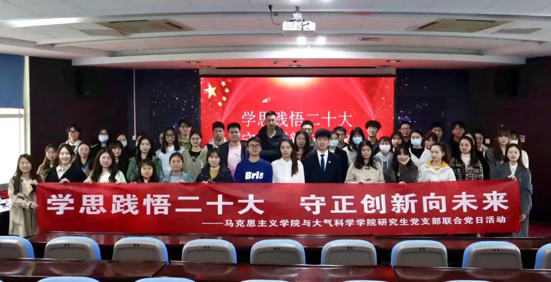 为进一步深化研究生党史学习教育,更好地把握和运用党的百年奋斗历史经验,认真学习宣传贯彻党的二十大精神,2023年3月27日,马克思主义学院研究生党支部与大气科学学院研究生第四党支部共同开展了以“学思践悟二十大,守正创新向未来”为主题的联合党日活动。大气科学学院周淑琴书记、马克思主义学院葛昕明书记、方群副书记、大气科学学院团委书记王晶、辅导员李萍应邀出席本次活动,两个共建支部的党员积极参与。
