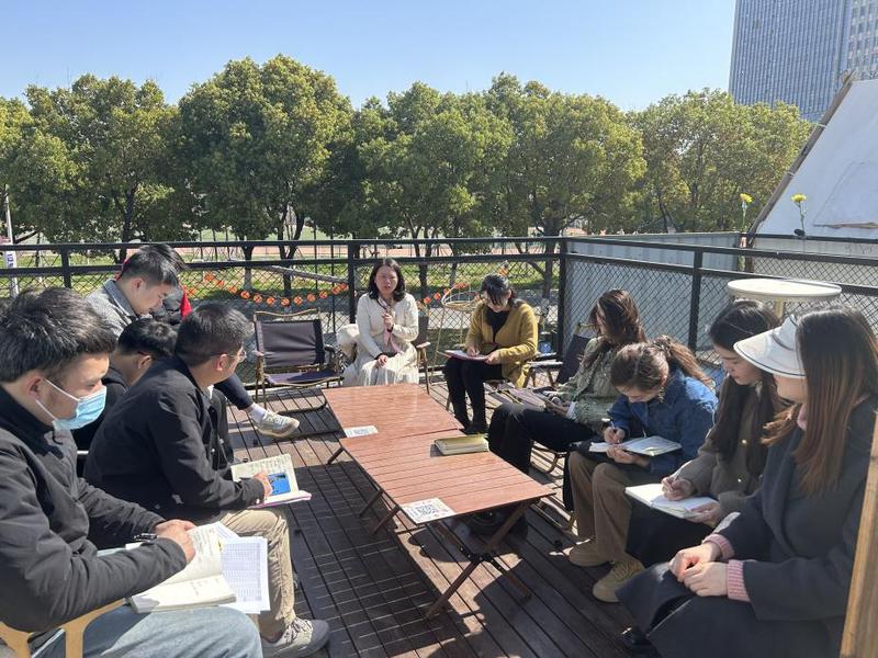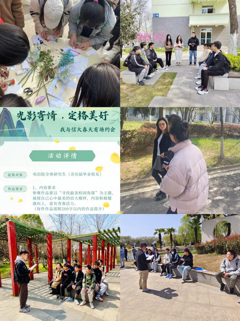 学院辅导员们结合工作实际,开展了形式多样、丰富多彩的环境育人活动。团委书记金红在图书馆门口草坪召开团学干部例会,并承办了学校百花双创节文创活动大赛;2022级年级主任黄开洁与两位22级辅导员一起在宿舍楼下的休闲区召开了新生班级骨干大会;研究生辅导员祁雪峰和王昕婷策划并开展了面向全体研究生和毕业校友的“我与信大春天有场约会”绘画摄影大赛;毕业班辅导员左香草在美丽的樱花树下与进入选调生考察的同学边走边进行考察面谈指导;负责党务工作的缪书选在户外长廊里召开了本科生党团骨干会议;胡志红与学院全体班长一起在天鹅湖畔户外开展了每周班长例会……