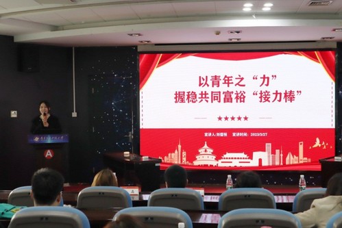接着,马克思主义学院的陈浩冉和刘儒恒同学分别以《走好科技自立自强的创新赛道,打赢关键核心技术攻坚战》、《以青年之力握稳共同富裕接力棒》为题进行理论宣讲,在场同学深受鼓舞,现场气氛持续升温。