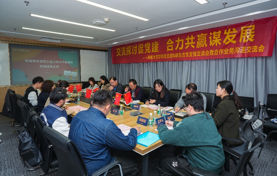3月29日下午,文学院党委副书记(主持工作)郭雨、副院长郑友奇带领公共英语教学部党支部支委成员前往新东方教育科技集团有限公司南京分校(以下简称“南京新东方”)开展党建等学习交流活动,南京新东方国际教育总经理张宁宁、南京新东方党支部书记董文昕以及党支部相关老师参加了交流会。活动由南京新东方党支部副书记刘晓烨主持。