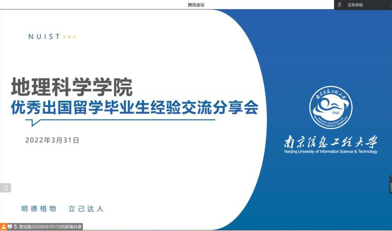 为帮助地科院同学们深入了解留学信息,拓宽国际视野,3月31日晚,地理科学学院举办了线上优秀出国留学毕业生经验交流分享会。本次分享会以腾讯会议的方式开展,学办主任张莹瑞主持,本科生辅导员谷雪、各年级学生踊跃参加。