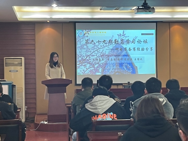 4月4日,电信院第69期研究生“勤笃”学术论坛在学科2号楼N201举行。本次论坛以“研电赛备赛经验分享”为主题,主讲人为电信院硕士研究生李志南、陶科、李胤演和王博文四位同学,他们所在团队均获得了第十七届中国研究生电子设计竞赛的国家级奖项。论坛由院研究生会学术部倪志伟同学主持,研究生辅导员左香草老师出席本次活动。