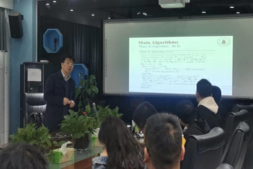 在此次报告中,宋教授主要介绍了在带宽受限的多传感器网络中未知确定性参数向量的分布式估计。他首先基于给定压缩维数总数的情况,讲述了联合设计维数分配和相应的压缩矩阵的概念。然后,他提出了罚分解法、乘子的连续二次上界最小化法和块坐标下降法来近似求解。最后,他通过数值实验详细介绍了PD和SQUM-M-BCD在异构场景下与现有策略相比的优点,并进一步说明了所提算法在相关噪声情况下的有效性。报告结束后,葛院长与宋教授共同讨论了理论假设与实际工程应用的问题,并再次表示对他此次报告的感谢。