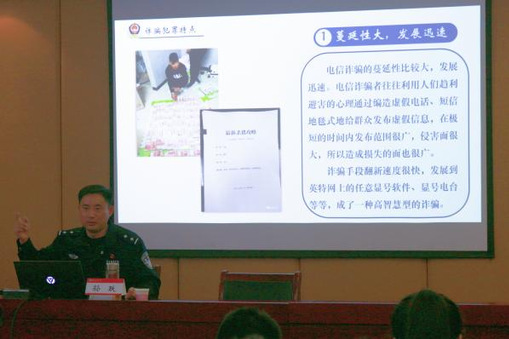紧绷防范之弦,远离诈骗之害。在第八个全民国家安全教育日来临之际,为进一步增强师生国家安全意识,提升广大师生防诈反诈能力,普及法律常识,筑牢安全防线,4月11日下午,电信院特邀盘城派出所南信大责任区民警孙跃警官在学科二号楼N201开展以“防范电信诈骗知识宣传教育”为主题的安全教育法制讲座,学院辅导员、各班安全员和宿舍长参加讲座,讲座由学院辅导员左香草主持。