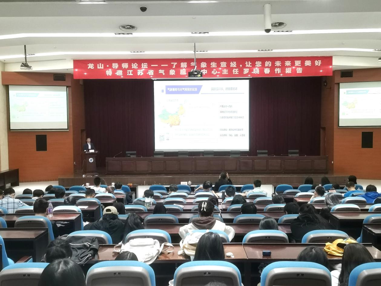 4月11日,龙山书院成功举办第十期“龙山·导师论坛”。本期论坛特邀江苏省气象服务中心主任罗晓春作题为《了解气象生意经,让你的生活更美好》的专题讲座。讲座由龙山书院党委副书记、副院长刘红梅主持,共200余名学生参与。