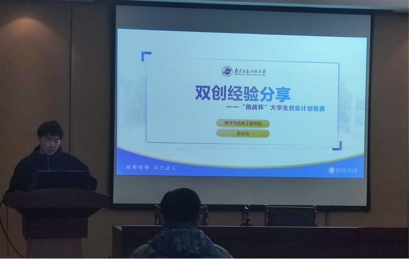 第十三届“挑战杯”中国大学生创业计划竞赛国赛银奖团队进行了经验分享。团队负责人郑金池从赛事介绍、参赛项目介绍等六个方面,全方位为同学们介绍了“挑战杯”比赛的参赛要求与注意事项。同时向同学们讲述了从选择项目、撰写申请表,计划书、制作PPT到路演答辩的整个流程,加深了同学们对比赛的了解,调动了同学们对科创竞赛的积极性。