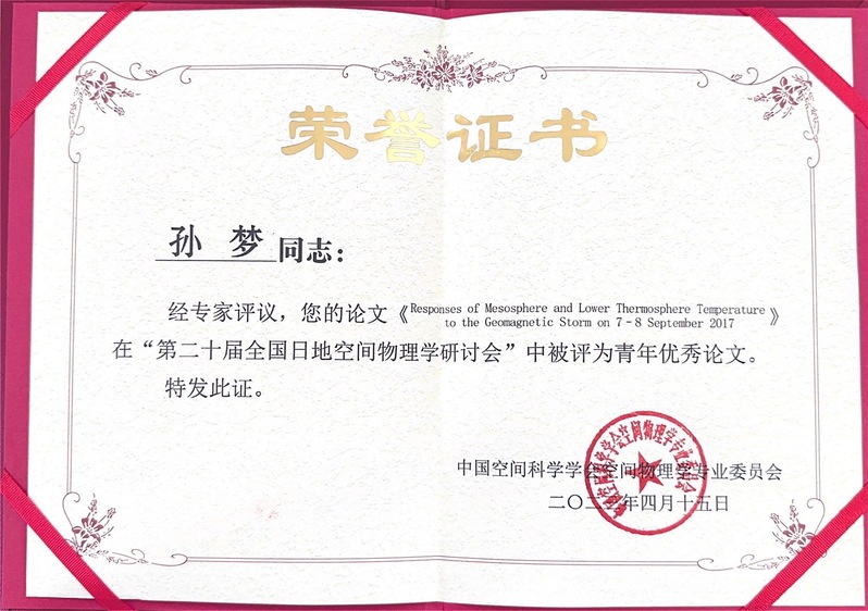4月13-15日,第二十届全国日地空间物理学研讨会在福州举行。我校大气物理学院空间天气研究所吕建永教授团队博士研究生孙梦的论文《Responses of Mesosphere and Lower Thermosphere Temperature to the Geomagnetic Storm on 7-8 September 2017》在此次研讨会中被评为青年优秀论文。