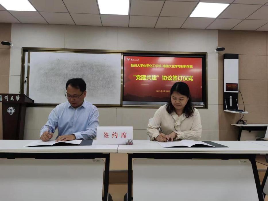 会上,双方首先召开共建交流座谈会。扬大化学化工学院院长庞欢详细介绍了学院的发展历程、学科特色、师资队伍、科学研究、人才培养的基本情况,杨春艳介绍了南信大化学与材料学院的基本情况、人才队伍建设、学生培养、以及学院党支部的设置、党建品牌创建等。随后,双方就学院发展过程中党的建设、学科专业、师资队伍、人才培养等方面的问题展开了深入的探讨与交流,达成合作共赢的共识。双方表示将通过资源共享、教师交流、科研协作等方式加强合作。娄金海、杨春艳代表双方签订了南信大化学与材料学院与扬州大学化学化工学院“党建共建”协议,开启了“结对共建”新篇章。