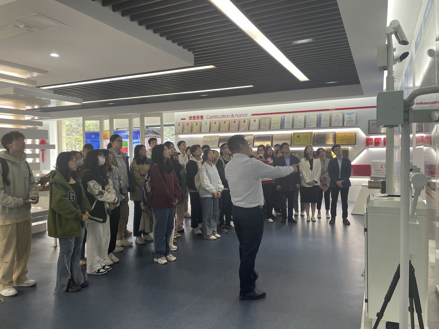 企业欢迎仪式后,全体师生在安徽蓝盾光电子股份有限公司副总经理张海燕女士的带领和讲解下参观了企业展厅,对企业的历史沿革、发展脉络、主要荣誉等有了深入了解,对企业主营的军工、气象、环保以及交通四大板块的产品有了直观的感知和认识。