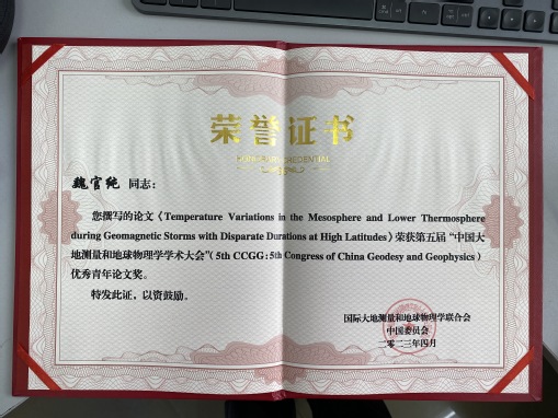 4月22至23日,第五届“中国大地测量和地球物理学学术大会”在武汉大学召开,吸引了来自全国数百家高校、科研院所等单位的3900余名专家、学者和学生参加。我校大气物理学院空间天气研究所硕士研究生魏官纯的论文《Temperature Variations in the Mesosphere and Lower Thermosphere during Geomagnetic Storms with Disparate Durations at High Latitudes》在此次大会中被评为优秀青年论文。