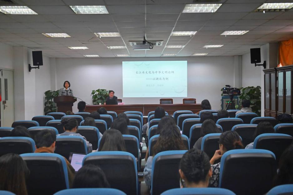 为了弘扬中华优秀传统文化,增强文化自信自强,挖掘长江文化,加强湖北和长江研究,提高广大师生的文学素养和文化自信,4月26日上午文学院主办的“明德·语言文学跨学科高层论坛系列讲座”在文德楼S517如期举行。 本次活动,特别聘请湖北大学吴成国教授做“长江水文化和中华文明论纲”主题报告。讲座由文学院院长赵霞教授主持,文学院副院长杜玉生教授、学院部分教师、研究生及本科生参加本次讲座。