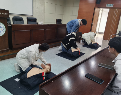 活动开始,校红十字会成员杜俊知同志围绕突发事件自救互救,对急救过程中的注意事项进行了重点介绍,并详细介绍急救操作方法以及心肺复苏知识。在掌握基本急救知识后,其他党员同志纷纷参与急救实践操作,在杜俊知的指导下利用模拟人轮流进行心肺复苏术的体验和练习,训练胸部按压、人工呼吸等急救技能。