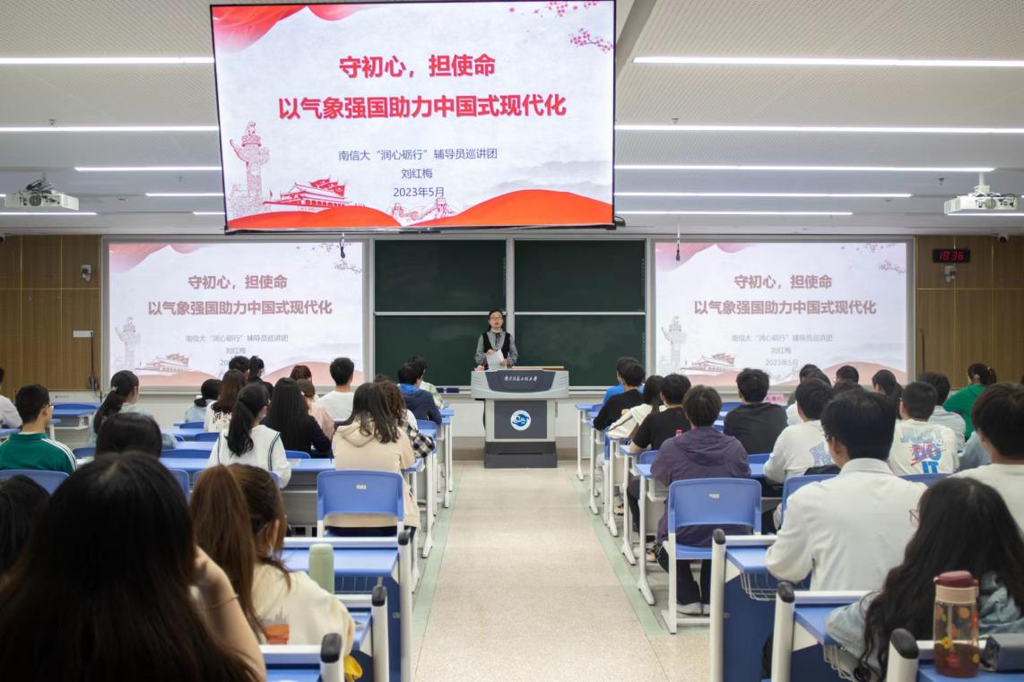 全体起立奏唱国歌后,由滑泽鑫同学宣读入党积极分子培训班纪律及相关注意事项。接着,刘红梅以《守初心,担使命——以气象强国助力中国式现代化》为题,从“忆峥嵘岁月,悟气象爱国初心”“扬时代新声,担气象报国使命”“献青春力量,谱气象强国华章”三个方面展开宣讲。刘红梅首先向同学们深情讲述了王诤、张乃召、涂长望、顾震潮、朱和周等先辈们的生平事迹,带领同学们追忆了在新中国气象事业开拓之初,那段气象工作者们艰苦奋斗的峥嵘岁月。随后,她分别围绕新中国气象事业“艰苦奋斗创业发展”“改革开放快速发展”“新时代创新理念高质量发展”三个时期,带领同学们共同回顾新中国气象事业70多年来走过的光辉历程和取得的伟大成就,感受气象事业始终根植于党和国家发展大局,与党和国家发展同心同向、同频共振的时代特征与突出贡献,深刻领悟气象报国担使命的时代内涵。最后,刘红梅结合党的二十大报告内容,对标党的二十大战略部署,解码中国式现代化对气象高质量发展的深刻指导意义,并向同学们分享了我校杰出校友助力气象事业高质量发展的励志故事,让在场同学深受感染,更加坚定了建设气象强国的信心,志要续写气象事业新篇章。