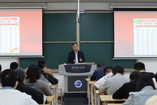 随后,张莹瑞从近5年学院毕业生深造与就业信息等数据出发,从考研、就业、考公等不同选择做出总结与建议。对于考研,他总结了往届毕业生考研失利的原因,建议大家合理规划时间,慎重选择院校专业;对于考公考编,告诫学生一定要调整心态,坚定信念;同时也对一些有出国留学以及就业创业的同学提出了一些建议。