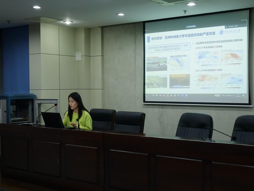 宋子祎报告主题为《北极无冰情景下东亚冬季气候的未来预估》,主要介绍了北极海冰变化对气候的影响、未来东亚冬季气候对北极无冰的响应等;宋晓蕾以《亚洲中纬度冬季温度的次季节反转及与NAO西移的关系》为主题,讲解了亚洲中纬度冬季温度的次季节反转的严重危害,为什么要研究亚洲中纬度冬季温度的次季节反转及与NAO西移的关系等,并通过丰富的图文为同学们进行了详细演示其研究成果。同学们踊跃提问,进行了专业的探讨,两位主讲人耐心回答,为同学们答疑解惑。最后,黄艳艳老师对两位研究生的汇报内容进行了总结及点评,引导同学们深入思考。