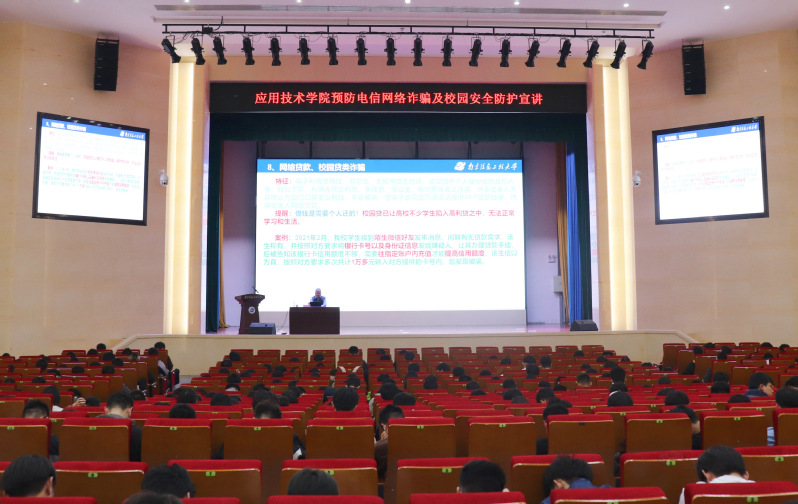 为进一步提升学生预防电信网络诈骗能力,增强学生安全防护意识,维护校园安全稳定,近日,应用技术学院在风云剧场开展预防电信网络诈骗及校园安全防护宣传培训。此次培训由南京信息工程大学保卫处副处长(主持工作)付兆锋主讲,应用技术学院党委副书记、副院长卢愿清主持,应用技术学院师生千余人参加了培训。