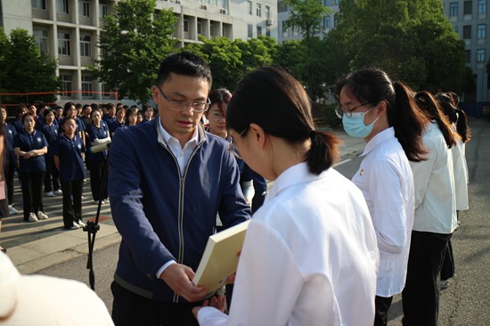 涂皛星为学院上期新发展党员颁发主题教育学习书籍,激励各位地科学子以先进典型为榜样,并勉励各位新发展党员加强理论学习,坚持学思用贯通,知信行合一,把中国特色社会主义思想转化为坚定理想、锤炼党性和推动学习工作的强大力量,持续在学生群体中发挥“旗帜”引领作用。