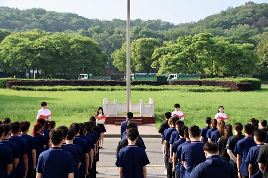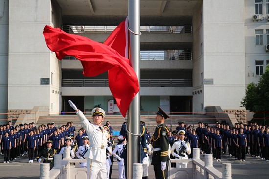 上午七时整,升旗仪式正式开始,国旗护卫队的队员们以昂扬的姿态护送国旗入场。《义勇军进行曲》奏起,国旗护卫队擎旗手振臂一挥,国旗冉冉升起,在场师生庄严注视、高唱国歌。