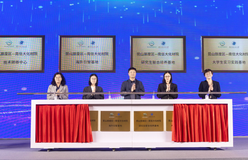 纪芳在致辞中表示,昆山作为全国首批创新型县(市),在高新技术和新兴产业发展方面具有广阔的市场发展和技术应用空间。南信大化材院与昆山旅度区搭建新能源新材料创新平台,是校地合作又一全新探索,也是科技镇长团招才引智的生动案例,将进一步强化和延伸昆山新材料产业链条,吸引更多大院大所先进基础材料、关键战略材料、前沿新材料领域科研成果落地转化,助推昆山旅度区在高质量发展新赛道跑出“加速度”。谷文华说,昆山旅度区和淀山湖、周庄、锦溪三镇对新能源、新材料等新兴产业发展的需求尤为强烈,希望双方不断丰富合作内涵、提升合作水平、扩大合作成果,携手开启校地合作新篇章。