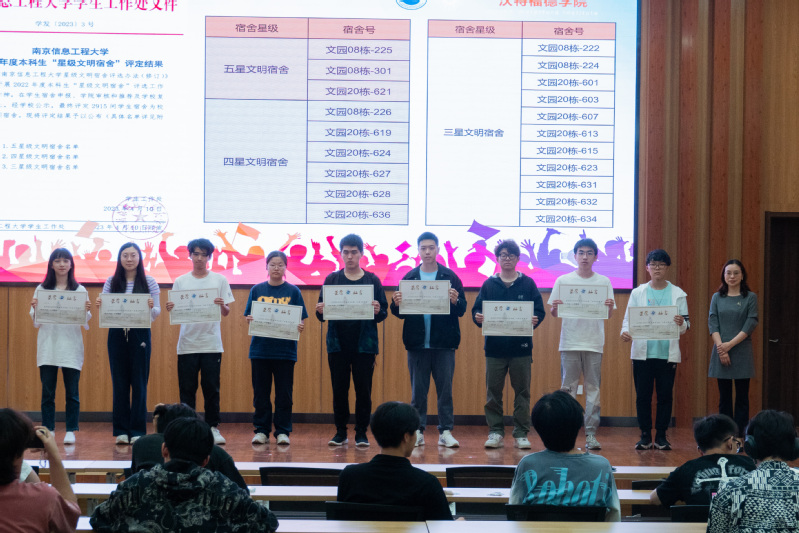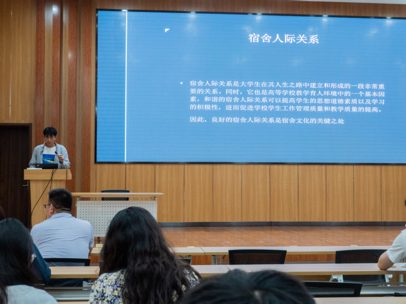 在星级文明宿舍表彰环节,丁媛媛为学院在校2022年度星级文明宿舍评选中获评五星、四星和三星的20间文明宿舍及宿舍长颁发了荣誉证书;随后文园20栋617室作为优秀宿舍代表进行了良好舍风建设经验分享,舍长柏迅同学以自己宿舍为例跟大家分享了良好的宿舍关系形成的关键,以及维持和谐宿舍关系、创建良好舍风的方法与技巧,用积极的视角看待室友,学会主动承认错误;接下来辅导员郑晓坤从严格宿舍用电安全、爱护宿舍公共财物、养成良好生活习惯、形成良好宿作舍风、加强道德法治意识等五个方面进行了宿舍安全教育。