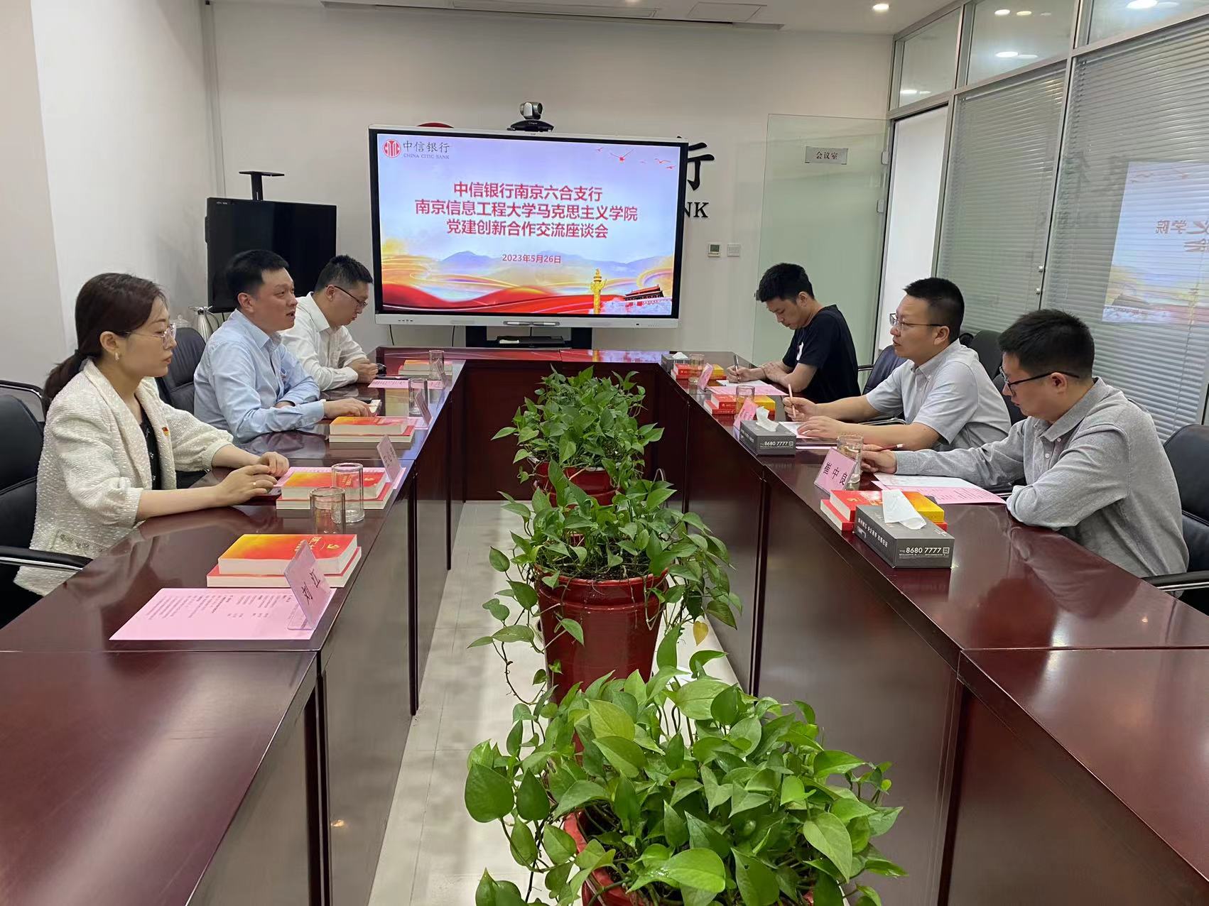 葛昕明介绍南信大马院的办学历程和学院党建工作的整体情况。他表示,中信银行六合支行在党建业务深度融合、党支部创新创优、党员先锋模范作用发挥等工作的特色做法和先进经验,非常值得学习借鉴。调研组将认真梳理总结调研成果,将调研成果与学院“党建+社会服务”工程有机融合,切实将其转化为推动学院党建引领事业高质量发展的工作成效。