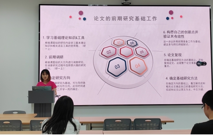 身兼多项学生干部职务的颜蒙蒙向同学们分享了如何更好地平衡学习科研与工作生活。她认为发表一篇SCI论文并不是一件遥不可及的事情,并从学习基础理论知识、前期调研、确定研究方向、确定研究方法、论文复现和构思创新点并验证其有效性等六个方面介绍了论文前期的基础研究工作,她还向同学们介绍了英文论文写作的技巧。她勉励大家虽然从前期准备到最后发表,这个过程也许困难重重,但是只要有明确的规划与执行下去的毅力,便可攻克万难。