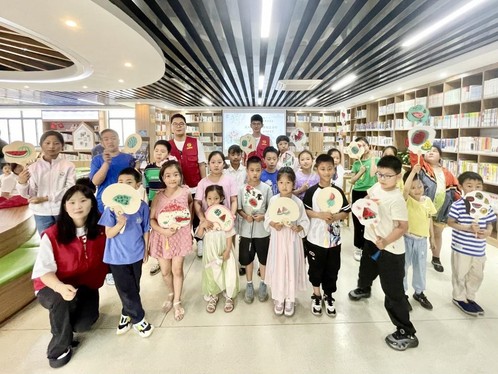 志愿者向小朋友们介绍了芒种和夏至节气的起源及相关习俗,创新地将气象知识与名著知识相结合,带领小朋友观看《红楼梦》中芒种节气送花神的节选视频,增强小朋友们对中华优秀传统文化的认同感;随后,志愿者们通过生动有趣的“滴水成雨”气象科普实验演示以及通俗易懂的解说,让孩子们认识到“成云致雨”的科学原理,并延伸介绍近期出现的“雷阵雨”、“梅雨”等现象,加深了孩子们对天气变化的理解。最后,志愿者们结合盘城街道现有西瓜品种,介绍了其外观特征和独特风味。在讲解扇子的制作过程和中国画的绘画技巧后,引导孩子们拿起毛笔,蘸取颜料,在空白的扇面上画出色彩丰富的西瓜图案。