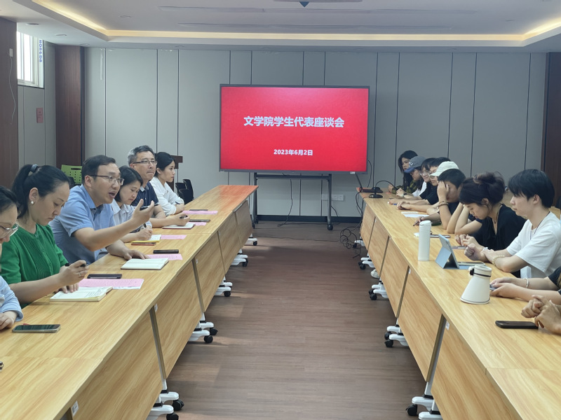 6月3日下午,文学院在文德楼N402会议室举行学生代表座谈会。院长赵霞,院党委副书记(主持工作)郭雨,副院长初清华,院党委副书记、副院长吴鹏飞,全体辅导员与14名来自不同专业、不同年级的本科学生代表亲切交流,倾听学生心声,了解学生动态与诉求,解决学生问题。座谈会由吴鹏飞主持。