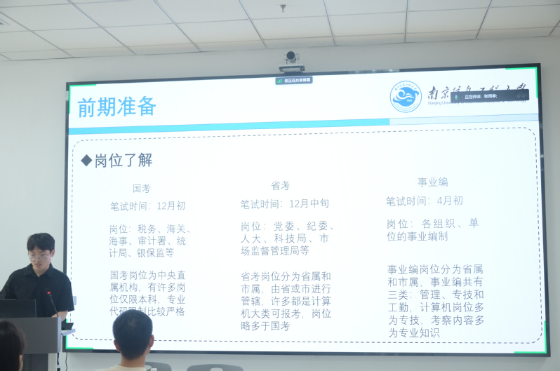 王能同学首先与大家交流了关于教师编制的报考经验。她详细介绍了从报名到笔试再到面试的详细流程,分享了自己的备考过程和获取信息、资料的方法。她提醒同学们要提前规划自己的求职道路,保持积极的心态并多多参加考试。田昊同学与大家分享了自己申请博士研究生的经验,他从读博的原因分析开始,详细的向同学们介绍了博士申请的流程和注意事项。他希望同学们能够趁早做准备,制定自己的职业规划和研究方向,有意识地提高自己的学术研究能力。曾磊同学分享了自己的求职历程和面试技巧,他以自己为例,向同学们介绍了确定就业方向、制作并投递简历以及面试的诸多技巧。针对国企和私企的不同特点,曾磊建议同学们能在求职的软硬能力上都做好准备,保持良好的心态去找到自己心仪的工作。王超智同学分享了自己的报考公务员和事业单位时的备考过程和面试经验。他为同学们梳理了公务员和事业编考试的岗位和报考时间,向同学们介绍了公务员和事业编制岗位的优缺点。他提醒同学们要做好思想准备,不要为了“上岸”而“上岸”,鼓励同学们抓住应届的机会,踏实复习、保持好的心态并勇于尝试。