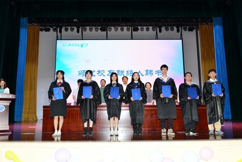 在毕业生们即将离开母校之际,学院为每一名毕业生定制了特殊的毕业纪念礼,并由与会领导为各班级代表颁发。同时,为顺利架起母校、学院与毕业学子们的沟通桥梁,与会领导为各班校友联络人颁发聘书。