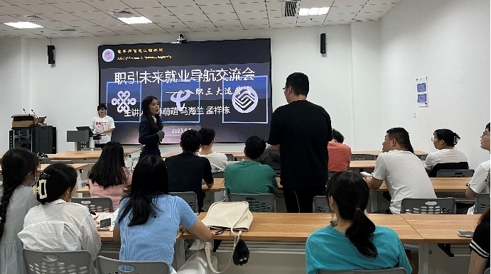 6月8日晚,电信院于信息科技大楼A103举办“职引未来”就业导航交流会系列活动,本次交流会以“三大运营商求职经验分享”为主题,邀请2020级电子信息专业孙萌萌、孟祥栋和2020级信息与通信工程专业马海兰三位硕士研究生同学主讲,院研究生会就服部部长潘鑫俣主持会议。